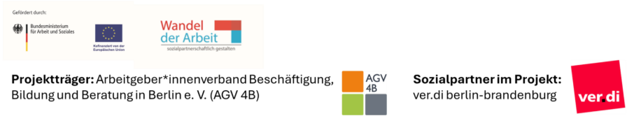 Das Projekt “Stärkung des Sozialpartnerschaftlichen Branchendialoges Beschäftigung, Bildung und Beratung in Berlin” (Branchendialog 4B) ist ein gemeinsames Projekt von ver.di und dem Arbeitsgeber*innenverband Bildung, Beschäftigung und Beratung in Berlin e.V. (AGV 4B). Es wird durch den Europäischen Sozialfond Plus (ESF Plus) und das Bundesministerium für Arbeit und Soziales (BMAS) gefördert.